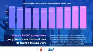 El Gobierno murciano ha destacado que la Región ha superado los 99.000 autónomos por primera vez desde que acabó la crisis económica y de empleo, gracias a la subida de 246 trabajadores por cuenta propia registrada en el mes de mayo (quinto mejor dato por autonomías). Así, la cifra total de este colectivo queda ahora en los 99.048, un dato que no era tan elevado desde los 99.230 que se contabilizaban al cierre del mes marzo del año 2009.