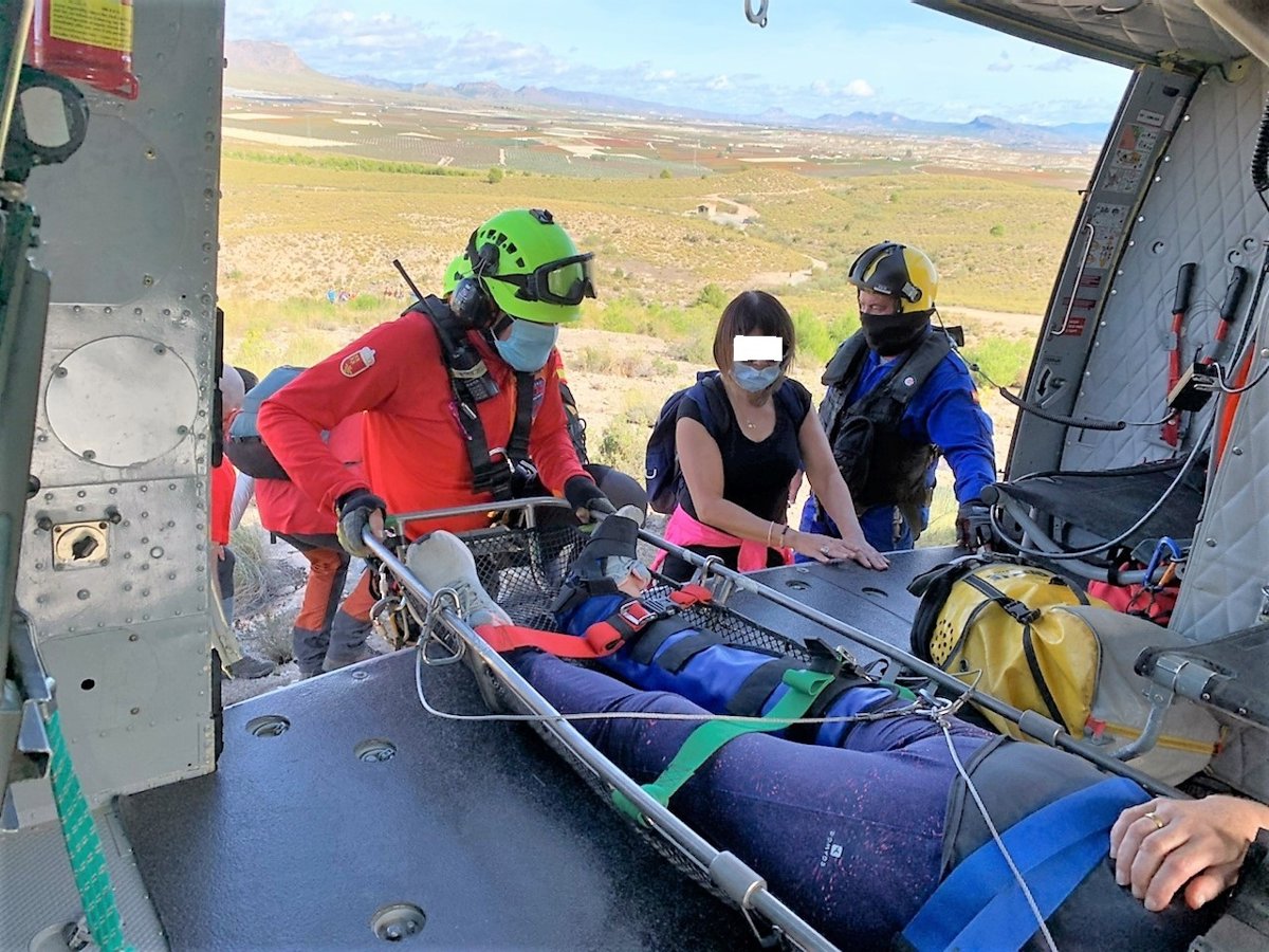 El grupo de rescate aéreo ha procedido al rescate de la mujer accidentada y a su traslado a la pista de atletismo situada junto al polideportivo, previamente habilitada por la Policía Local de Cieza para su aterrizaje.