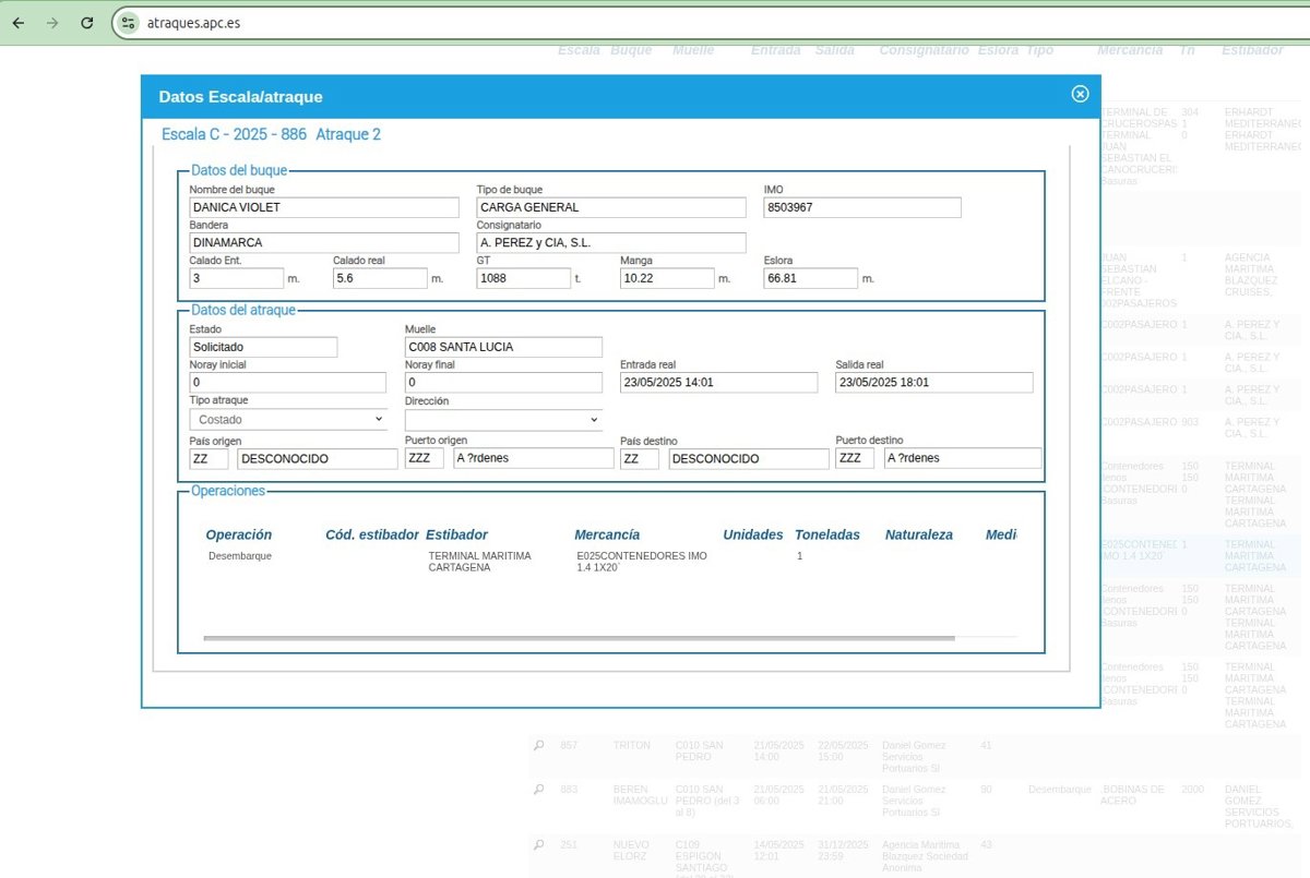 Imagen de los datos de la llegada del Danica Violet este viernes a Cartagena - RESCOP