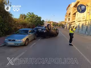 Un conductor resulta ileso al volcar su vehículo y provocar daños en otros dos coches en Murcia - POLICÍA LOCAL DE MURCIA