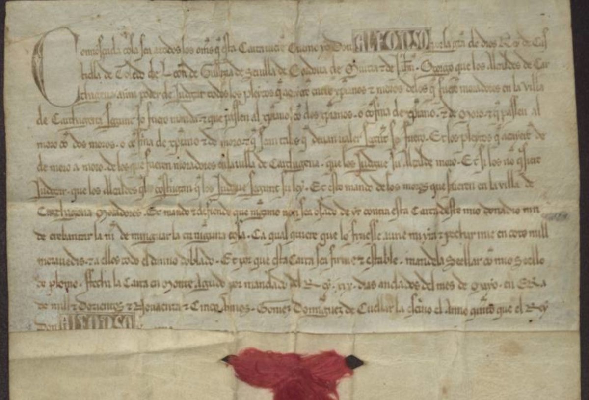 El Archivo Municipal de Cartagena ha seleccionado como documento del mes una carta de Alfonso X a la ciudad de Cartagena en el año 1257. En ella se otorgaban a los alcaldes de la ciudad la capacidad de juzgar los pleitos entre cristianos y moros.