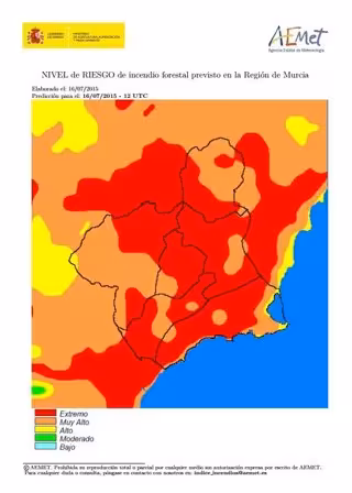La Agencia Estatal de Meteorología (Aemet) ha advertido que el riesgo medio de incendio forestal es este jueves extremo en casi toda la Región de Murcia y tan solo es muy alto en las comarcas del Noroeste y el Altiplano, según fuentes del Centro de Coordinación de Emergencias consultadas por Europa Press.