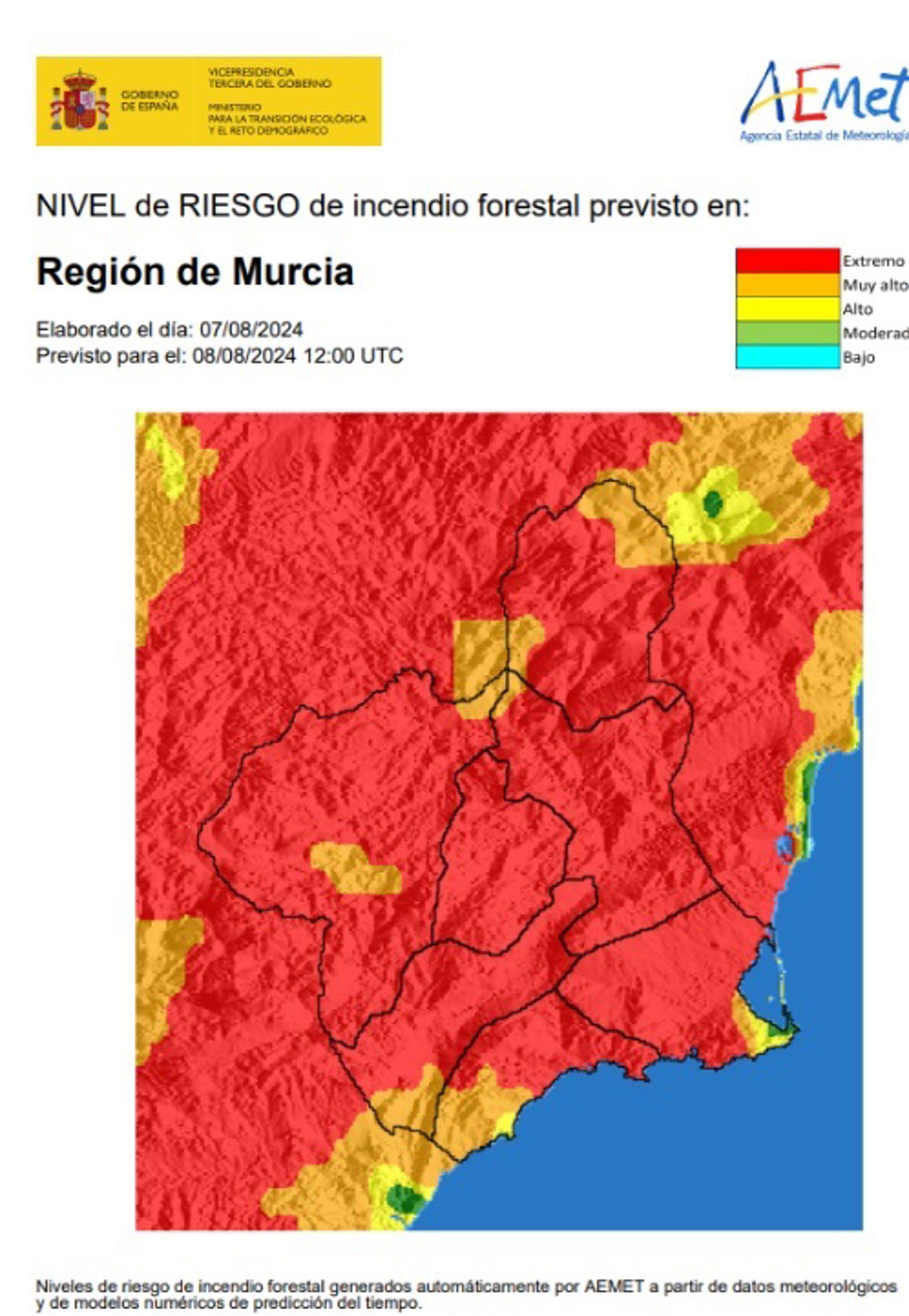 El nivel de riesgo de incendio forestal previsto por la Agencia Estatal de Meteorología (Aemet) para este jueves es extremo en toda la Región, según fuentes del Centro de Coordinación de Emergencias consultadas por Europa Press.