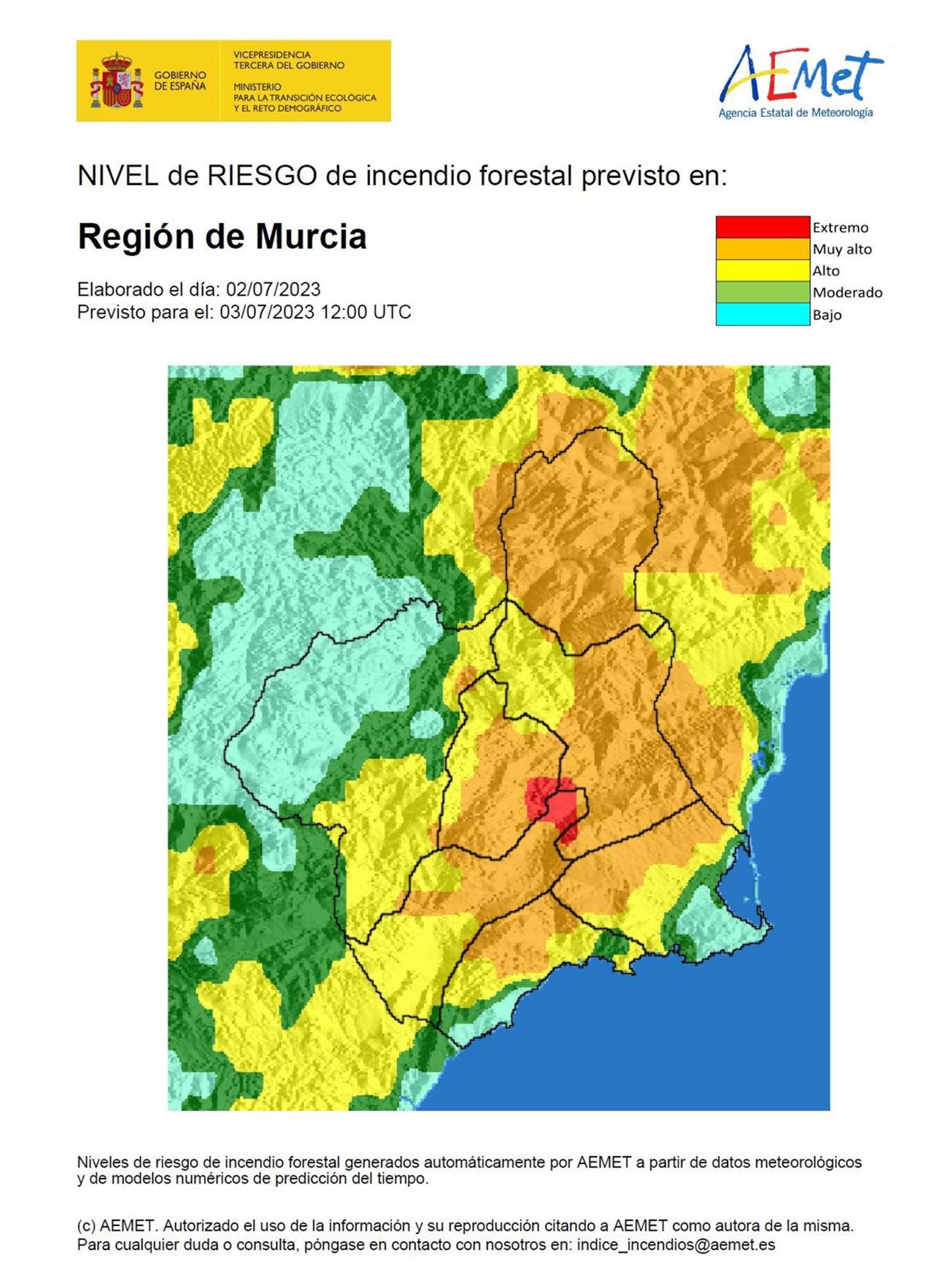 La Agencia Estatal de Meteorología (Aemet) ha informado en su boletín de riesgo de incendio forestal previsto para este lunes, 3 de julio, para la Región de Murcia, que es muy alto en su mayor parte.