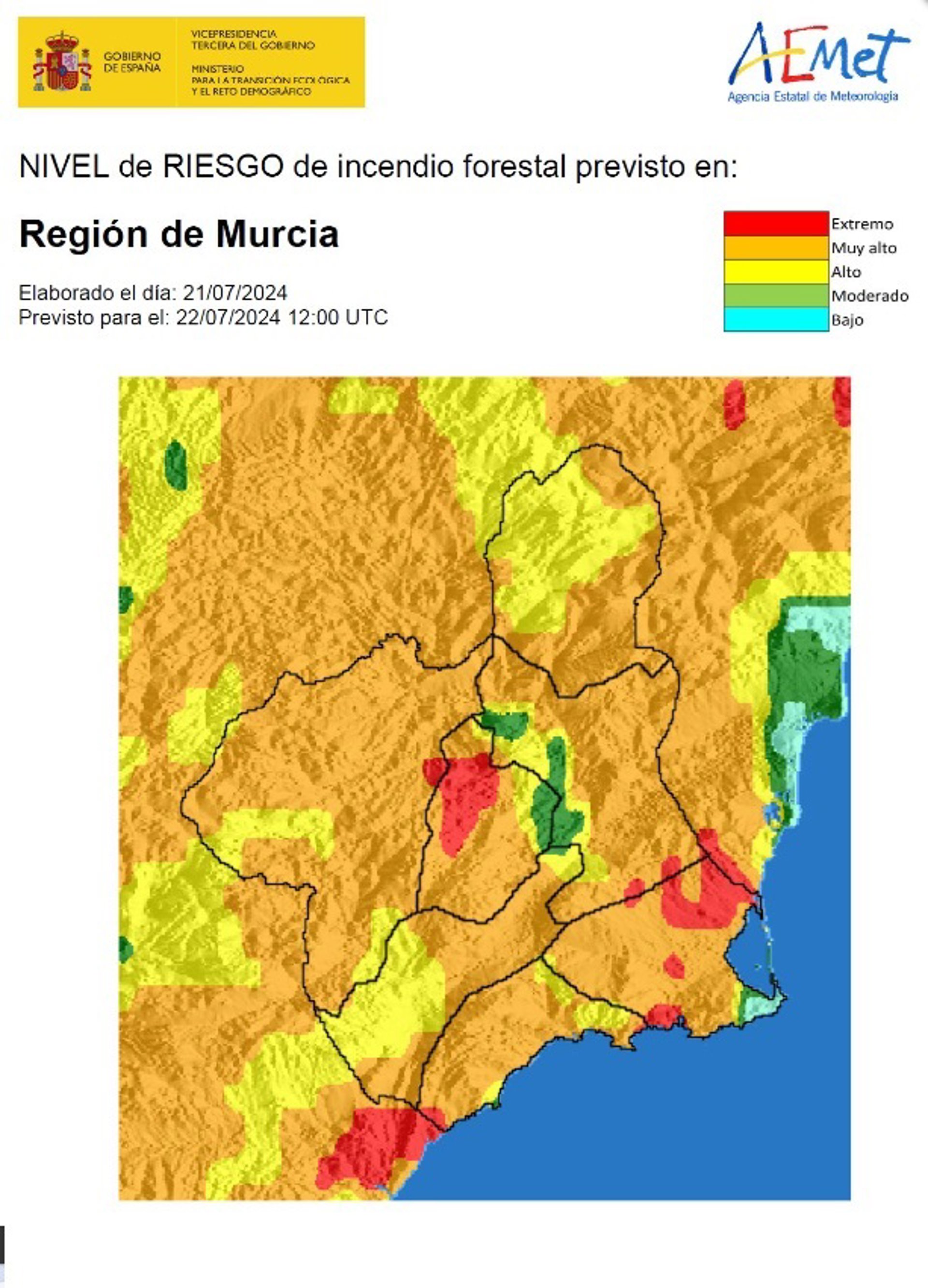 El nivel de riesgo de incendio forestal previsto por la Agencia Estatal de Meteorología (Aemet) para este lunes es muy alto en toda la Región, según fuentes del Centro de Coordinación de Emergencias consultadas por Europa Press.