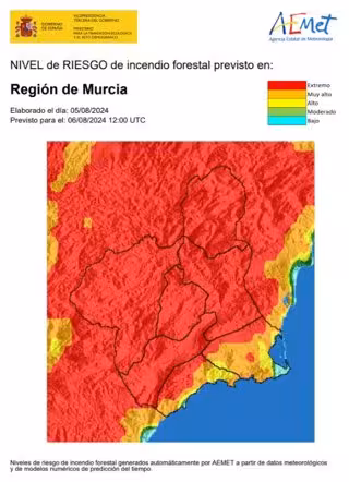 El nivel de riesgo de incendio forestal previsto por la Agencia Estatal de Meteorología (Aemet) para este martes es extremo en casi toda la Región excepto en el litoral, donde es muy alto, según fuentes del Centro de Coordinación de Emergencias consultadas por Europa Press.