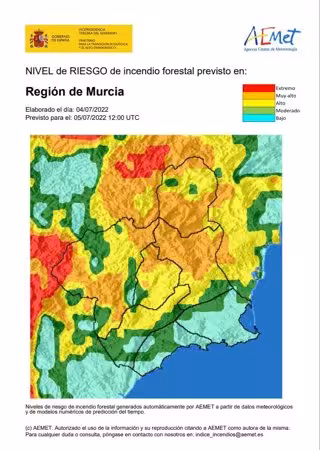 El nivel de riesgo de incendio forestal previsto para este martes, 5 de julio, por la Agencia Estatal de Meteorología (Aemet) es muy alto en el Altiplano, y alto en la Cuenca de Mula, Vega Alta-Ricote-Murcia y el Noroeste.