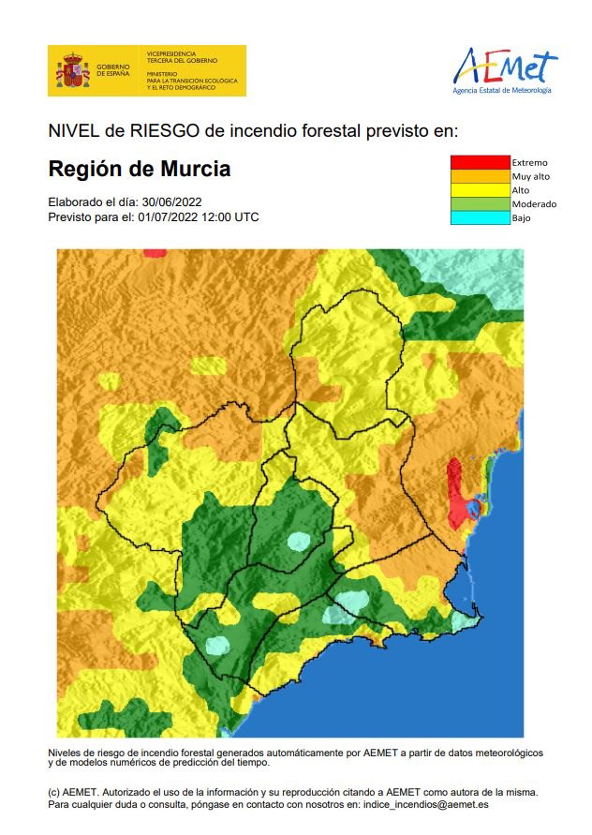 El nivel de riesgo de incendio forestal previsto para este viernes, 1 de julio, por la Agencia Estatal de Meteorología (Aemet) es alto en el Altiplano, el Noroeste, el litoral este y Vega Alta-Ricote-Murcia.
