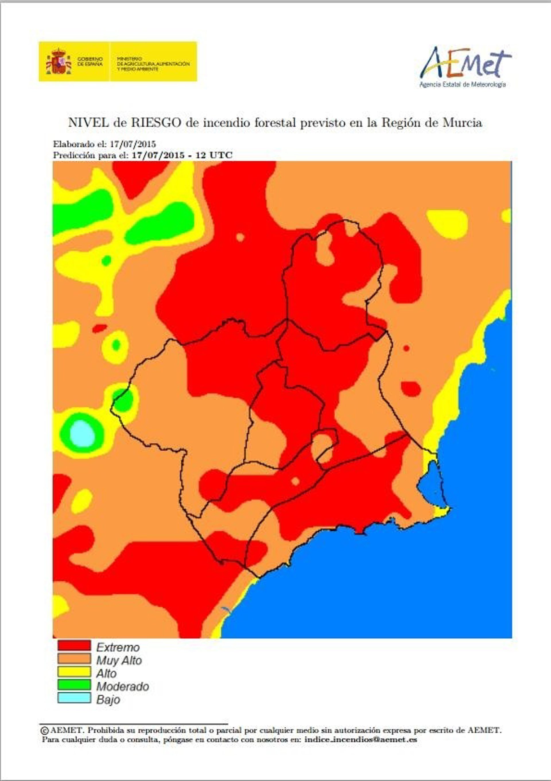 El riesgo de incendio forestal previsto para este viernes por la Agencia Estatal de Meteorología es extremo o muy alto en la Región de Murcia, según fuentes del Centro de Coordinación de Emergencias consultadas por Europa Press.