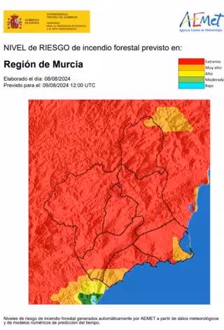 El nivel de riesgo de incendio forestal previsto por la Agencia Estatal de Meteorología (Aemet) para este viernes es extremo en toda la Región, según fuentes del Centro de Coordinación de Emergencias consultadas por Europa Press.