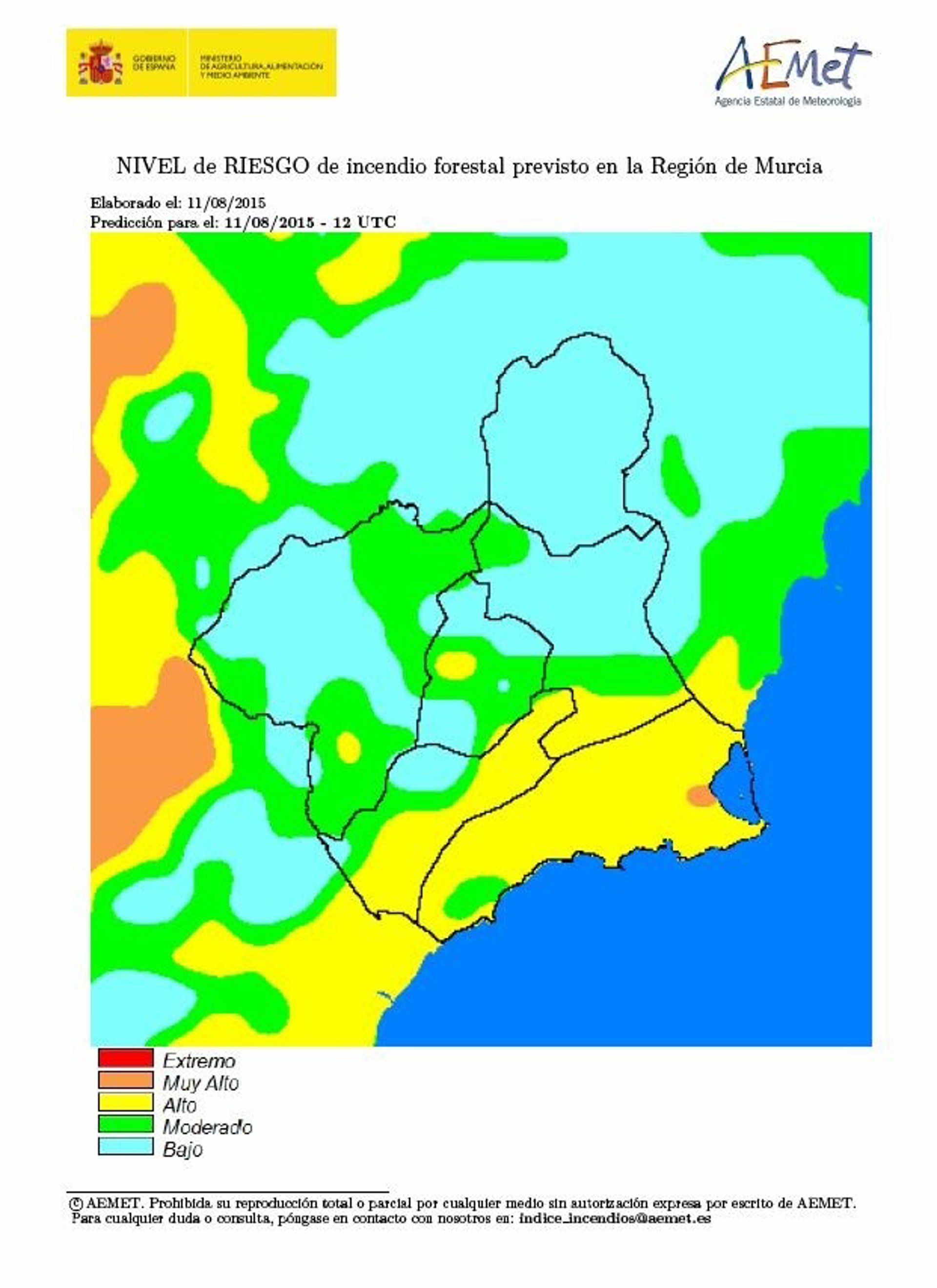 La Agencia Estatal de Meteorología (Aemet) ha establecido el riesgo de incendios forestales alto en toda la Región de Murcia, excepto en la comarca del Altiplano, donde es bajo.