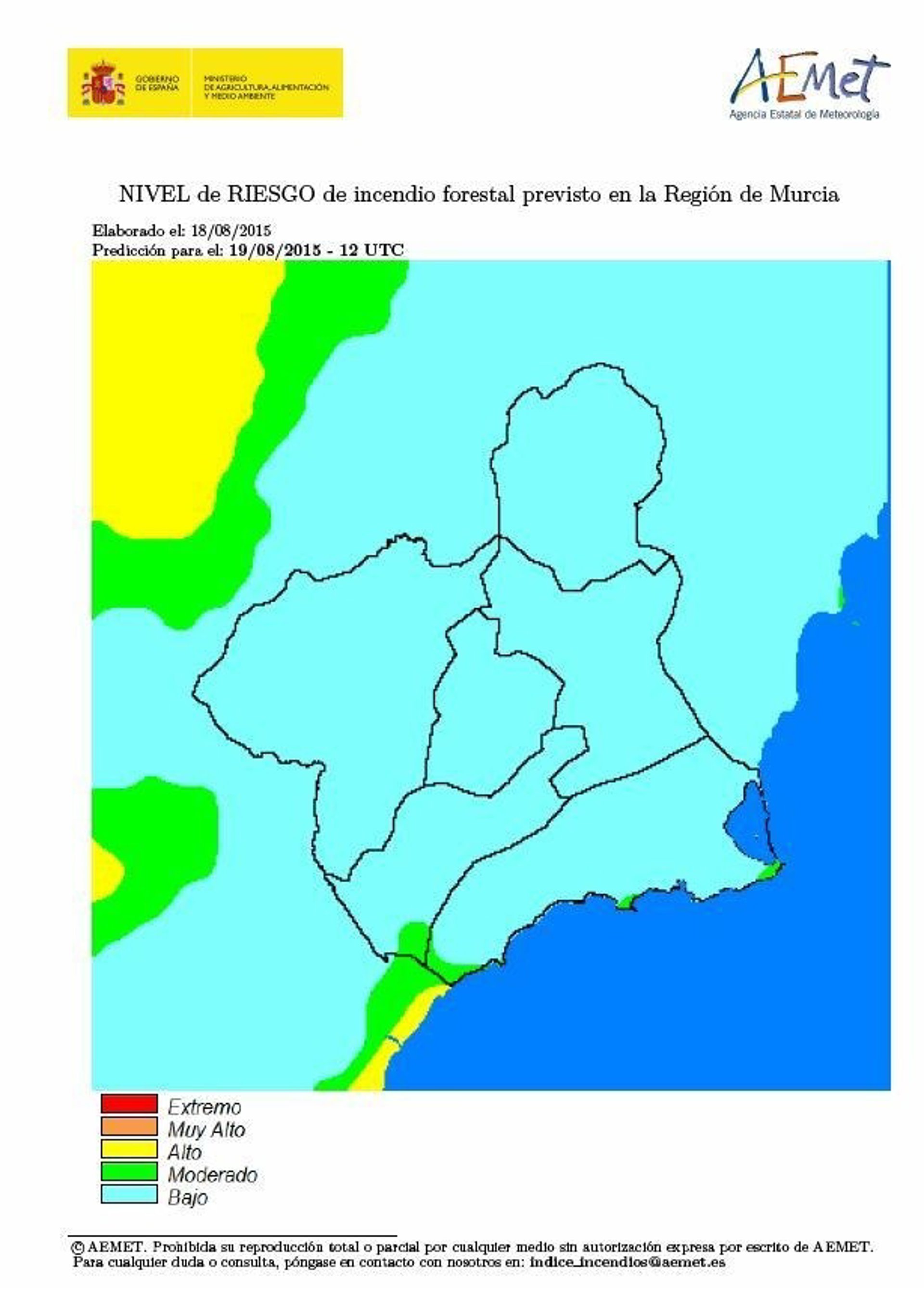 El riesgo de incendio forestal previsto para este miércoles es moderado en zonas del litoral y el Guadalentín, según han informado fuentes del Centro de Coordinación de Emergencias. En el resto es bajo.