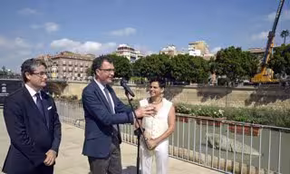 El alcalde de Murcia, José Ballesta, junto al concejal de Empleo, Turismo y Cultura, Jesús Pacheco, han asistido este martes al encuentro con los medios que ha ofrecido el funambulista del Circo del Sol Vicente Quirós, previo al gran espectáculo de equilibrismo que llevará a cabo este miércoles sobre las aguas del Segura.