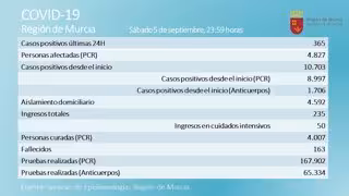 El número total de afectados en la Región de Murcia desde el comienzo de la crisis asciende a 10.703 casos, de los que 8.632 han sido acreditados mediante PCR (365 más que el día anterior), según los datos del Servicio de Epidemiología correspondientes a este sábado a las 23.59 horas.