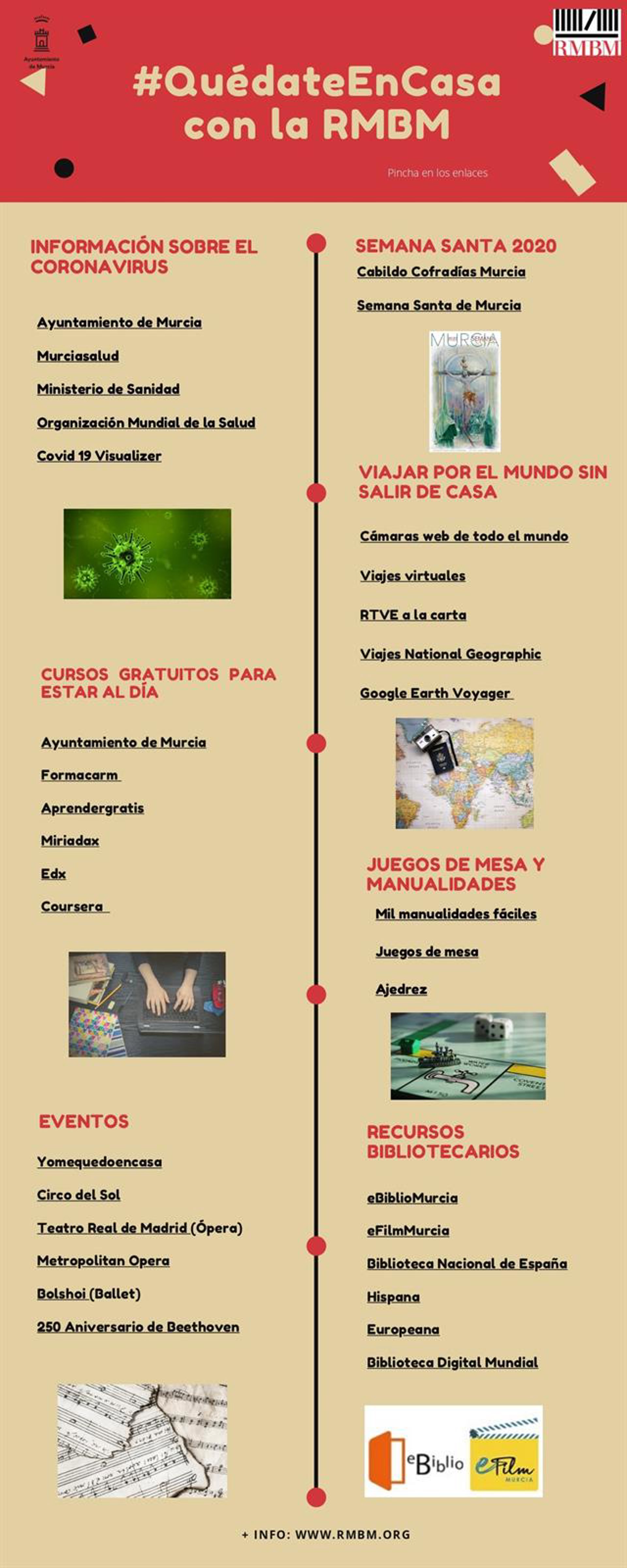 Así, el programa ofrece información sobre el coronavirus a través de enlaces a fuentes oficiales; cursos gratuitos para estar al día; Semana Santa; viajar por el mundo sin salir de casa; eventos y juegos de mesa y manualidades, recursos bibliotecarios y eventos culturales.