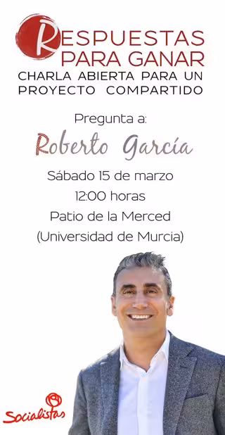 El precandidato a las primarias del PSRM-PSOE para representar a su partido en las elecciones autonómicas de mayo de 2015, Roberto García, ha invitado a todos los militantes a que acudan este sábado 15 de marzo al acto central de su campaña que tendrá lugar en el patio de la Merced.