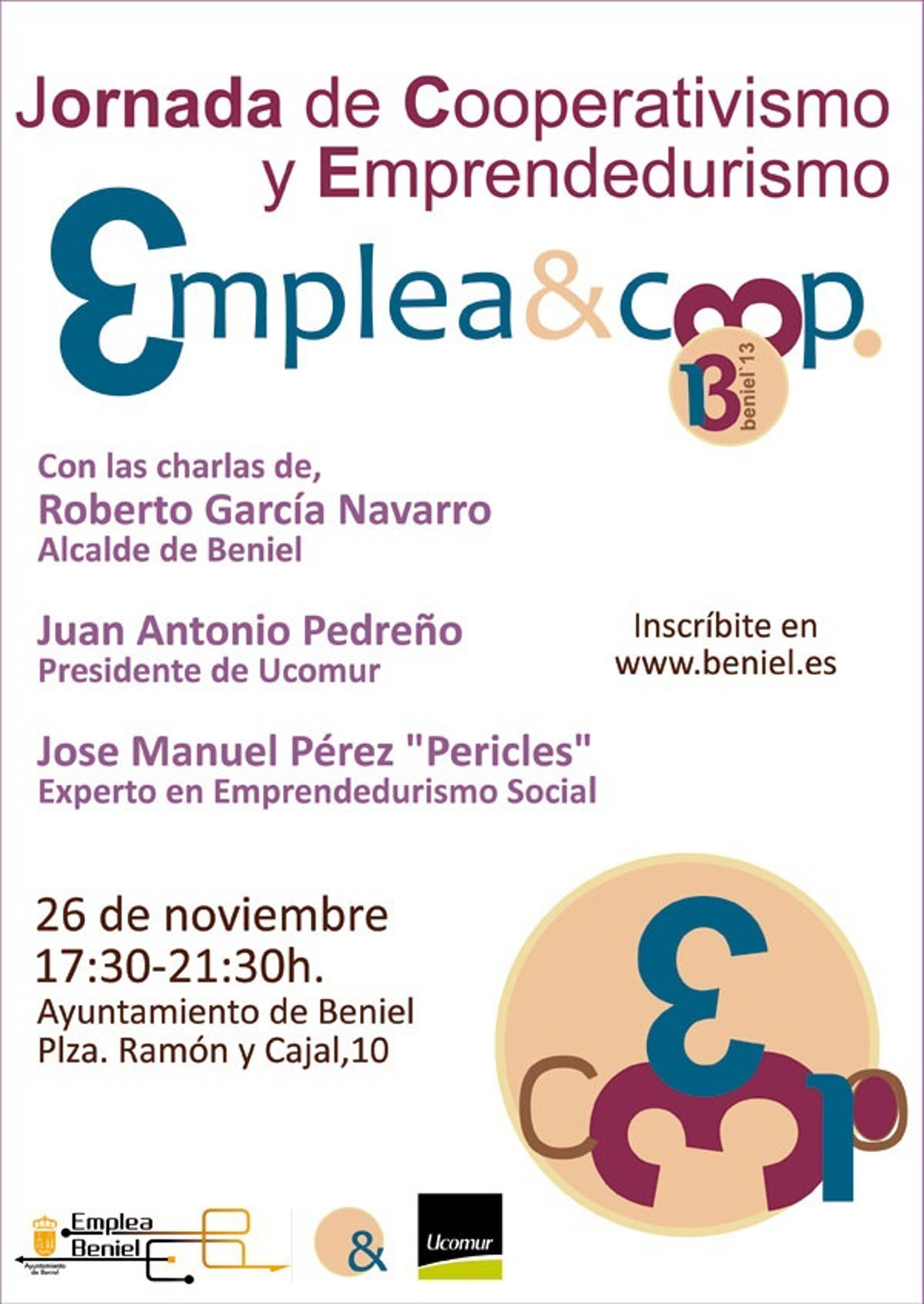 El Ayuntamiento de Beniel, en colaboración con la Unión de Cooperativas de la Región de Murcia (Ucomur), expondrá este martes las claves para generar empleo con la celebración de la jornada 'Emplea&Coop', que tendrá lugar en el Salón de Plenos del Consistorio, según han informado fuentes municipales en un comunicado.