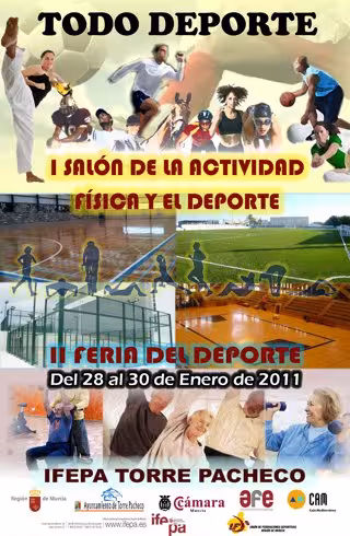 Esta sábado abre sus puertas en Ifepa el I Salón de la Actividad Física y el Deporte, a las 13.00 horas, un acto que será presidido por el director general de Deportes, Antonio Peñalver, a quien acompañarán el alcalde de Torre Pacheco y presidente de Ifepa, Daniel García Madrid, y su director gerente, Antonio Miras, según han informado fuentes de la organización del evento en un comunicado.