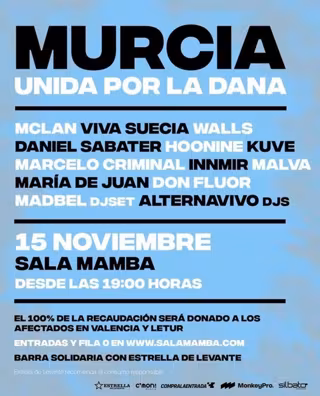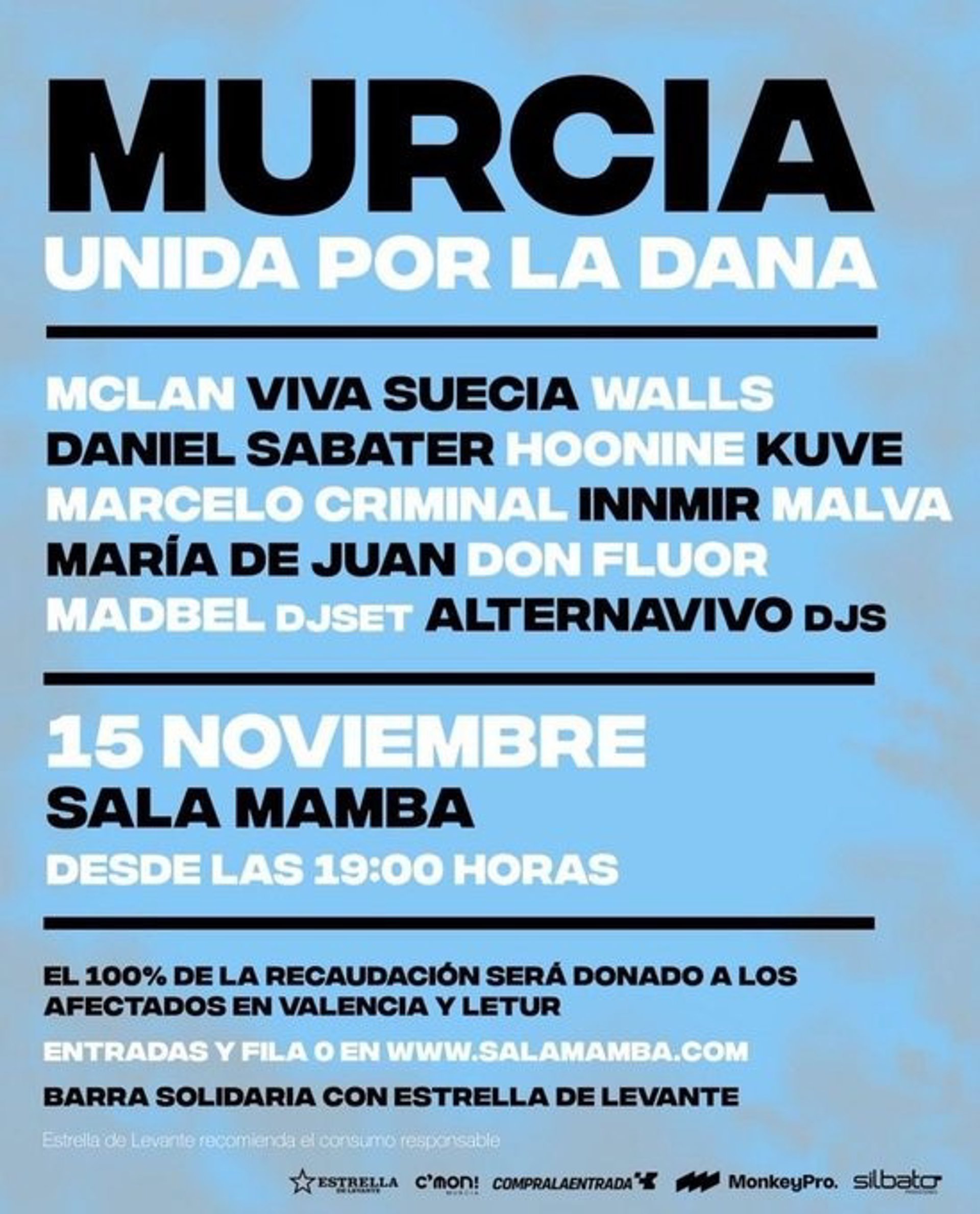 La Sala Mamba de Murcia organiza el próximo 15 de noviembre un microfestival solidario en beneficio de los afectados por la DANA de Valencia. La sala afirmaba este martes en sus redes sociales que desde que vieron lo que ocurría en las comunidades vecinas empezaron "a pensar en la mejor forma de ayudar".