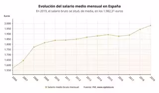 En el conjunto del país, el salario medio mensual subió un 1,9% en 2019, hasta los 1.982,3 euros, su cifra más alta desde que comenzó la serie en 2006.