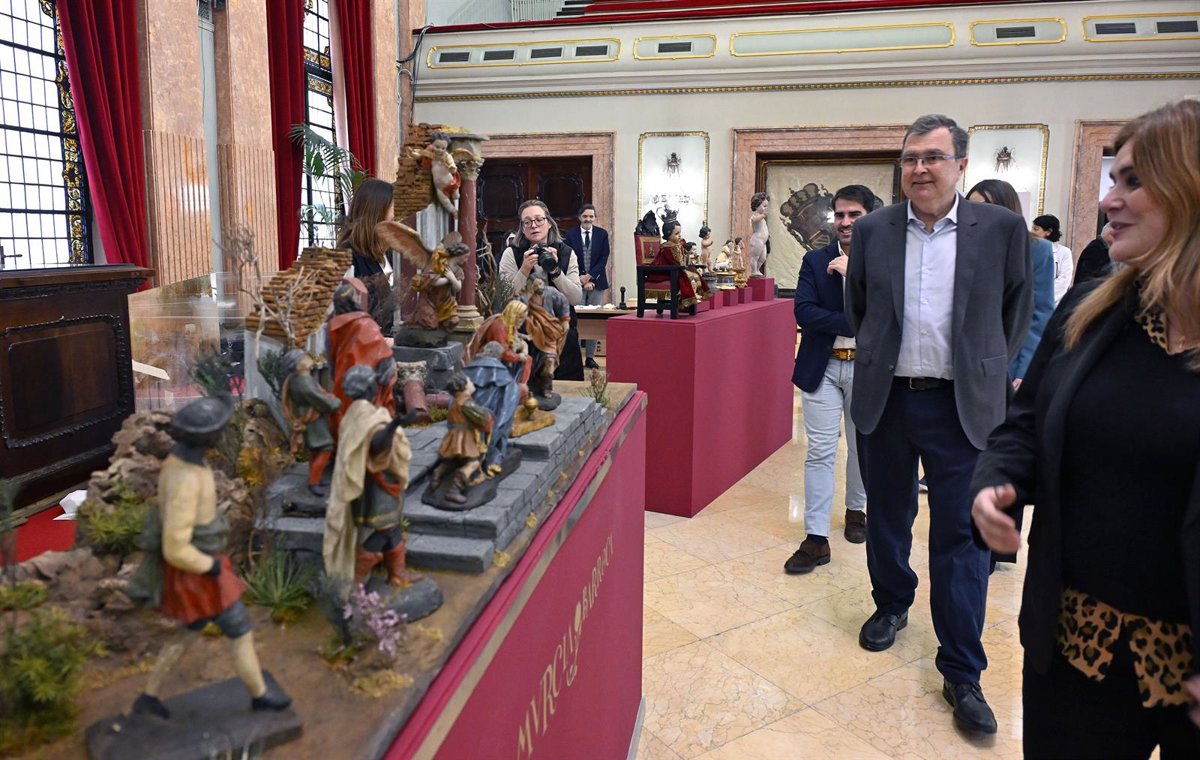 El alcalde, José Ballesta, acompañado por los concejales Diego Avilés y Mercedes Bernabé, visita el montaje del belén monumental que rinde homenaje a Nicolás Salzillo, padre del escultor murciano Francisco Salzillo, bajo el título 'Laigmaniere' - AYUNTAMIENTO DE MURCIA