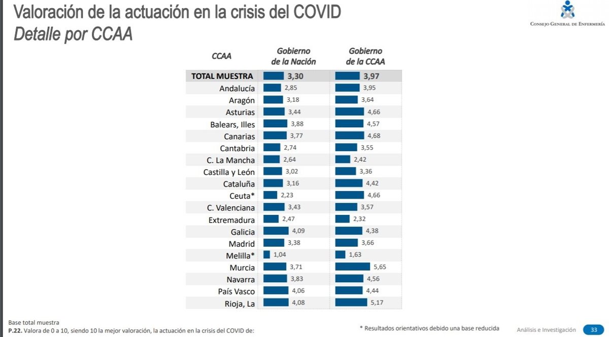 En este sentido, desde la Salud han explicado que la publicación del Consejo General de Enfermería reflejaba la valoración de los enfermeros de la gestión de la crisis del Covid por parte del Gobierno de la Región de Murcia, que fue calificada con "la mejor puntuación de España", indican desde la consejería. Concretamente, y según esta encuesta, daban a la Región un 5,65.