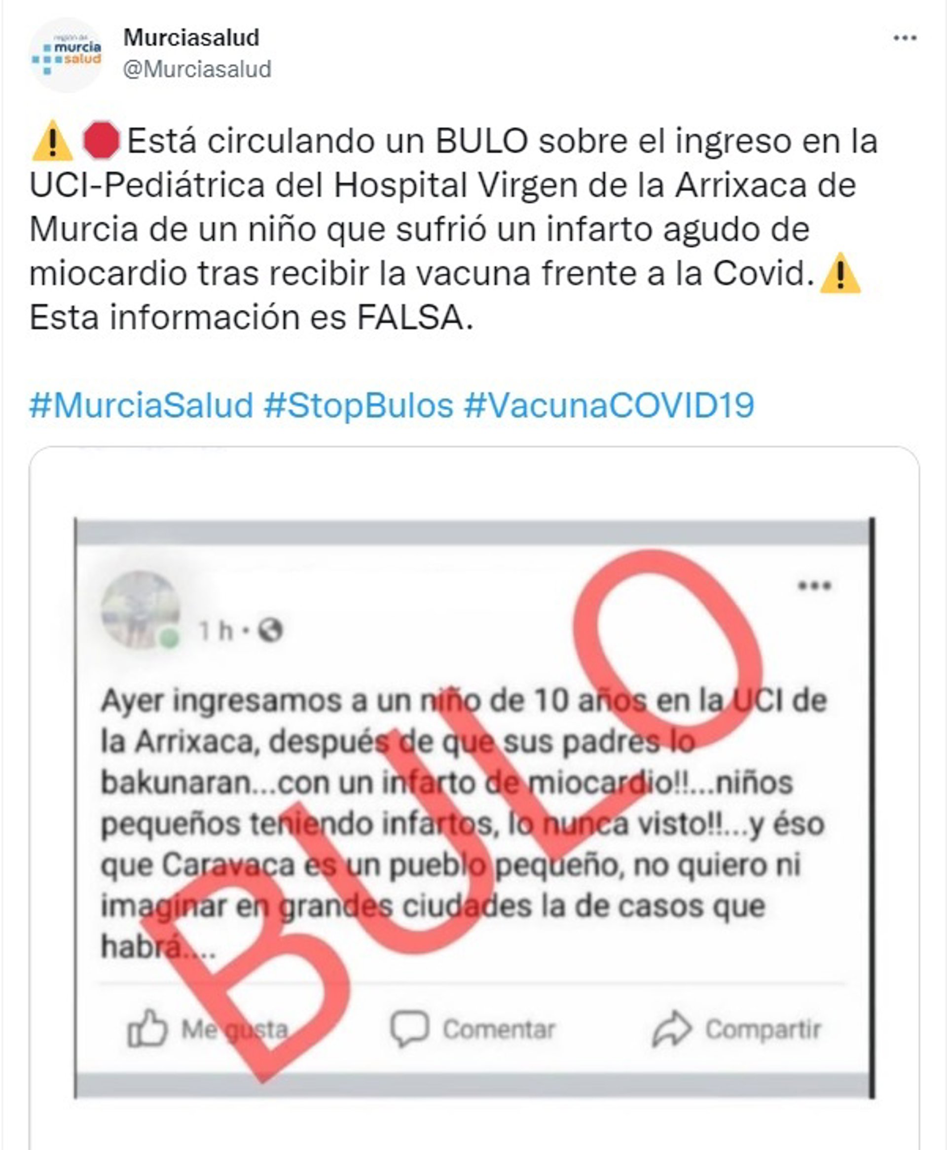 La Consejería de Salud ha alertado de que está circulando por redes sociales un bulo sobre el ingreso en la UCI pediátrica del Hospital Virgen de la Arrixaca, en Murcia, de un niño que sufrió un infarto agudo de miocardio tras recibir la vacuna contra la Covid.