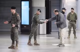 Un hombre le da gel desinfectante a uno de militares de la División Acorazada del Ejército que controlan la estación durante el cuarto día laborable del estado de alarma por la crisis del coronavirus en España, en Madrid (España), a 19 de marzo de 2020. - Eduardo Parra - Europa Press - Archivo