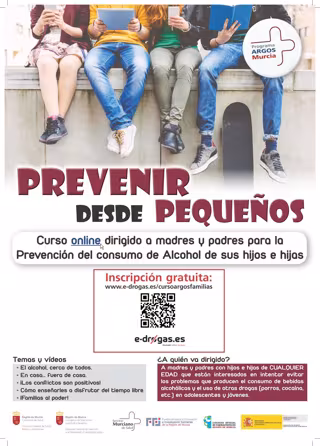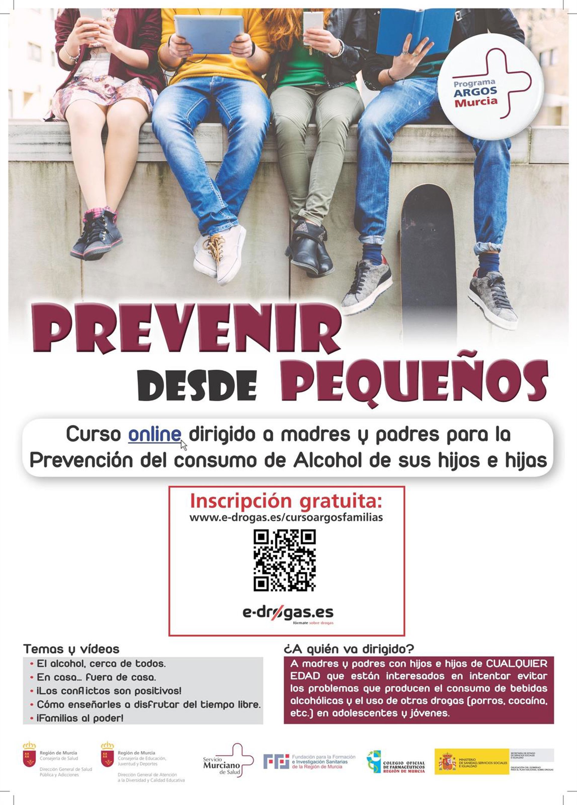 Cartel de 'Prevenir desde pequeños: Curso online destinado a padres y madres para la prevención del consumo de alcohol de sus hijos e hijas' - CARM