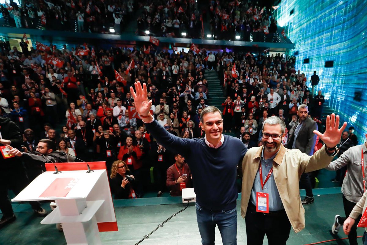 En Cartagena, el secretario general del PSOE y presidente del Gobierno, Pedro Sánchez junto al secretario general de la Región, Francisco Lucas, clausurando el 17º Congreso Regional del PSRM-PSOE. - EDU BOTELLA
