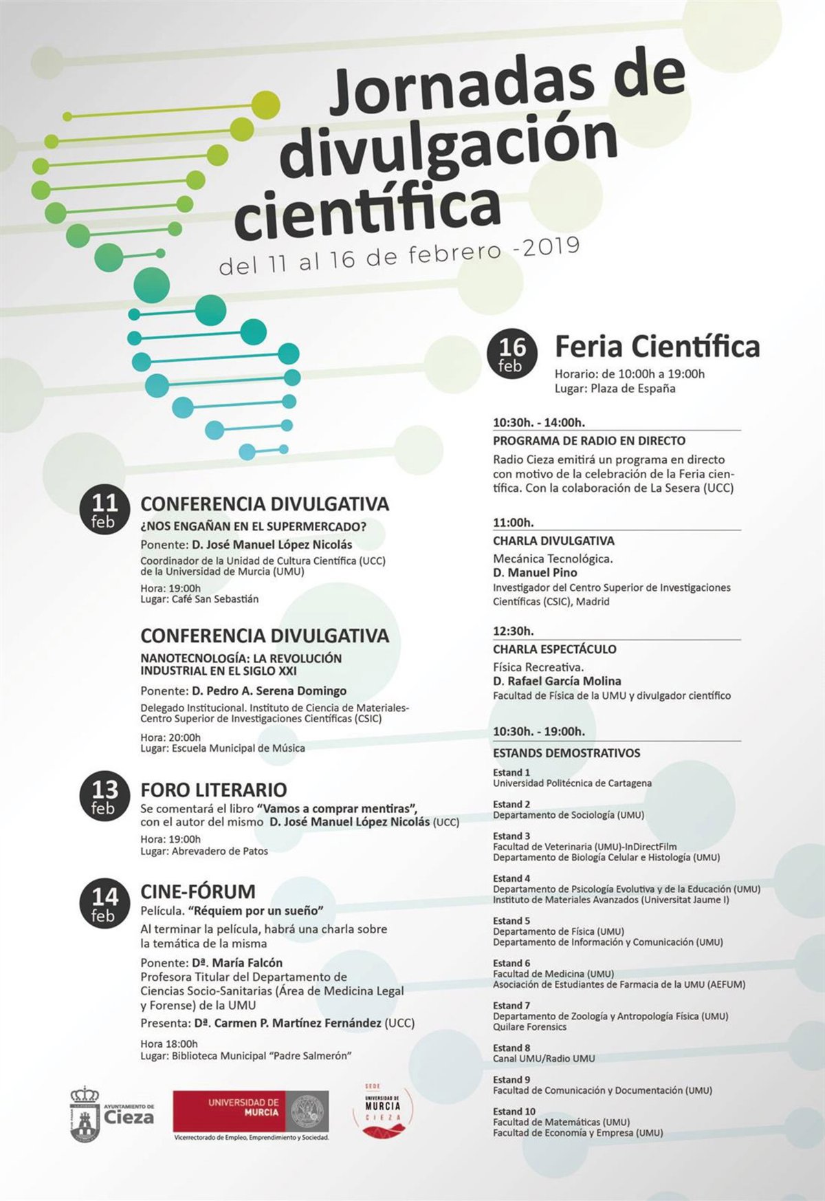El día 16 girará en torno a la feria científica, que se instalará en la plaza de España desde las diez de la mañana y hasta las siete de la tarde. Durante toda la jornada habrá expositores de diferentes facultades de la Universidad de Murcia harán demostraciones y enseñarán sus trabajos a quienes se acerquen.