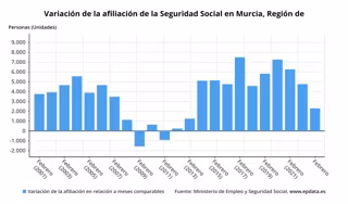 La afiliación media a la Seguridad Social en la Región de Murcia se situó en febrero en 626.012 personas, lo que supone en términos absolutos un aumento de 2.300 con respecto al mes anterior (+0,37%), según datos del Ministerio de Inclusión, Seguridad Social y Migraciones publicados este jueves.