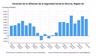 La afiliación media a la Seguridad Social en la Región de Murcia se situó en febrero en 593.950 personas, que supone en términos absolutos un aumento de 6.265 personas con respecto al mes anterior (1,07 por ciento), según datos del Ministerio de Inclusión, Seguridad Social y Migraciones publicados este martes.