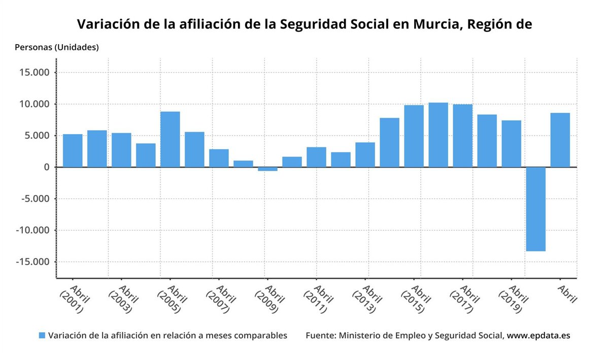 La afiliación media a la Seguridad Social en la Región de Murcia se situó en abril en 607.532 personas, que supone en términos absolutos un aumento de 8.596 personas con respecto al mes anterior (1,44 por ciento, el segundo más alto del país, solo por detrás de Islas Baleares --2,75 por ciento--), según datos del Ministerio de Inclusión, Seguridad Social y Migraciones publicados este miércoles.