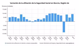 En términos medios, la afiliación creció en la Región en 13.173 personas en los últimos doce meses (+2,1%).