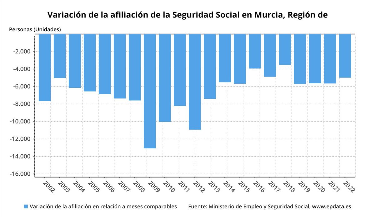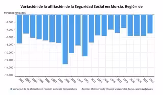 Gráfico que muestra la variación de la afiliación en la Región de Murcia en relación a meses comparables - EPDATA