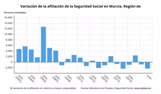La afiliación media a la Seguridad Social en la Región de Murcia se situó en julio en 637.014 personas, lo que supone en términos absolutos un descenso de 2.287 con respecto al mes anterior (-0,36 por ciento), según datos del Ministerio de Inclusión, Seguridad Social y Migraciones publicados este martes.