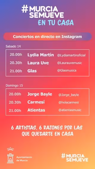 Tres artistas murcianos participarán este domingo en 'Murcia Se Mueve en tu casa', una iniciativa impulsada por el Ayuntamiento de Murcia, desde la concejalía de Movilidad Sostenible y Juventud, que supone el despliegue de tres conciertos en directo por Instagram.