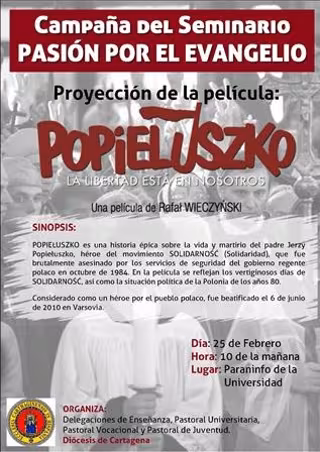 Después de la acogida y la proyección de la película en el Paraninfo de la UMU, el Delegado de Pastoral Universitaria, Antonio Andreu, presentará la película del beato 'Popieluszko', para pasar a continuación al visionado.