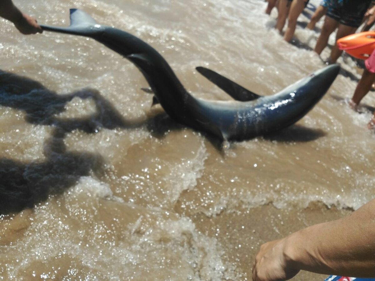 La tintorera, de un metro y medio aproximadamente, había quedado varada en la playa de Bolnuevo, junto al camping.