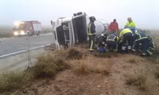 Un hombre ha tenido que ser rescatado este lunes tras volcar el camión que conducía, por causas que se desconocen, cuando circulaba por la carretera de Yecla a Montealegre del Castillo, antes del límite con la provincia de Albacete, según han informado fuentes del Centro de Coordinación de Emergencias.