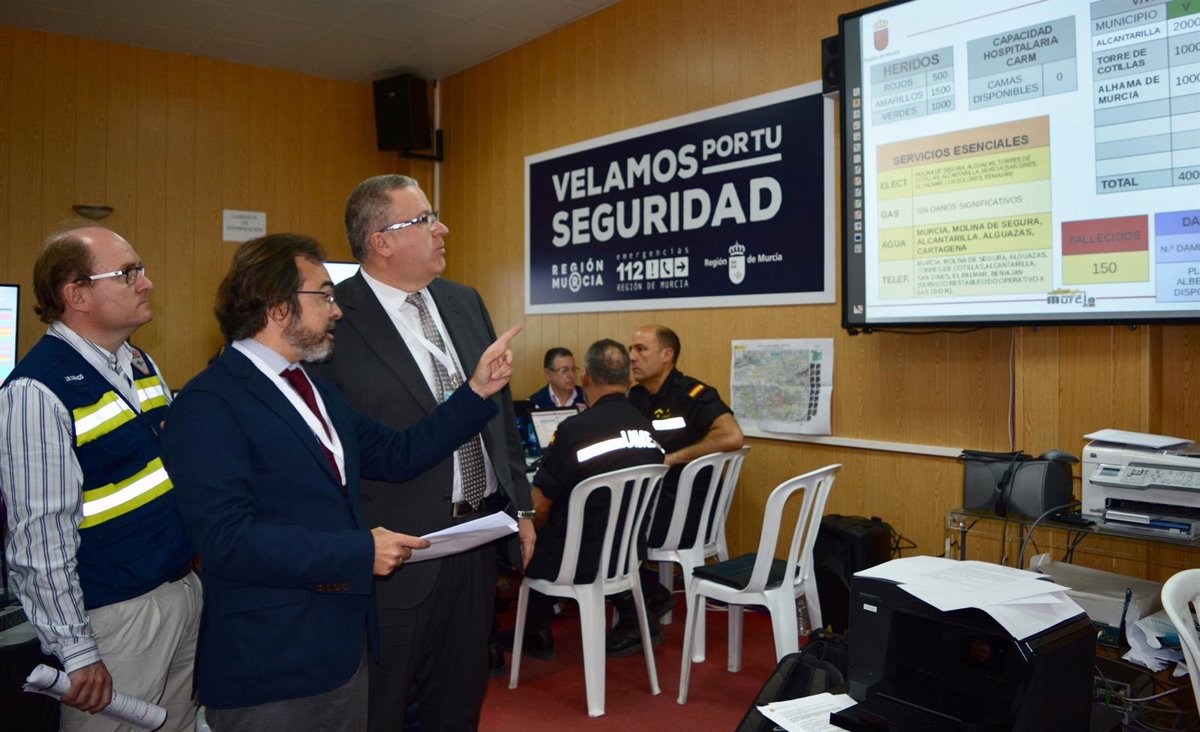 El consejero de Presidencia, Pedro Rivera, junto con el delegado del Gobierno en la Región de Murcia, Francisco Bernabé, han reunido este martes al Consejo Asesor del Centro de Coordinación Operativa Integrada, constituido este lunes en el marco del simulacro de emergencia que se desarrolla en la Región.