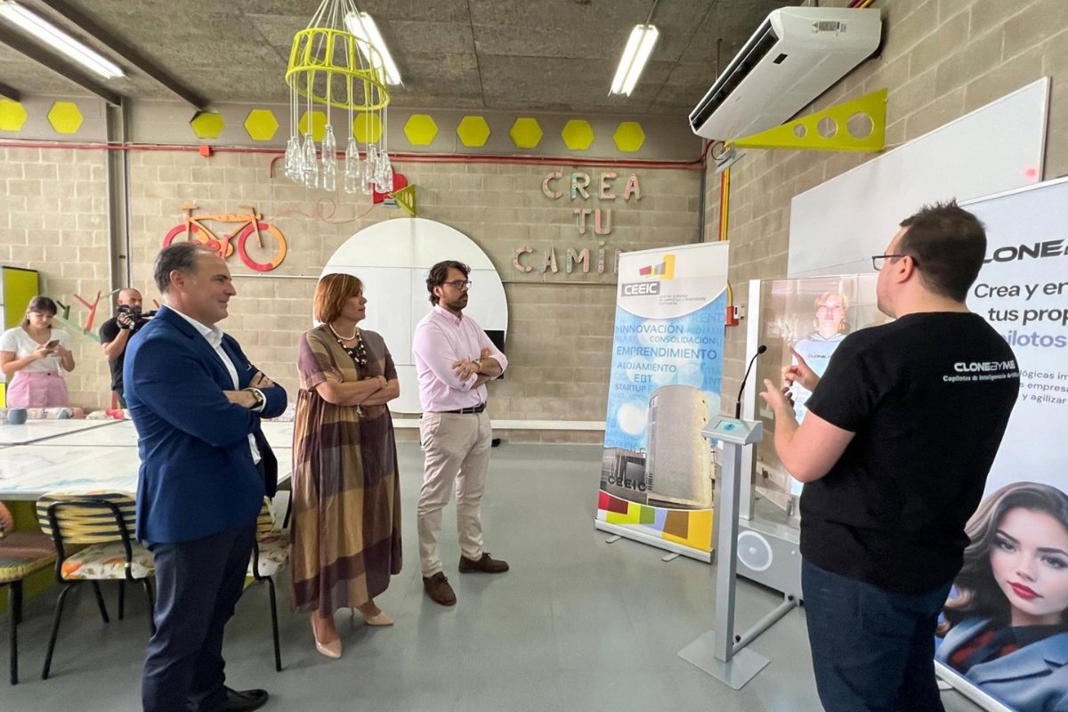 El concejal de Empresa de Cartagena, Álvaro Valdés, ha conocido este viernes a 'Chloe', un agente de atención al cliente multilingüe que puede interactuar cara a cara. Chloe ha sido desarrollada por la startup ubicada en el CEEIC de Cartagena, CloneByMe.