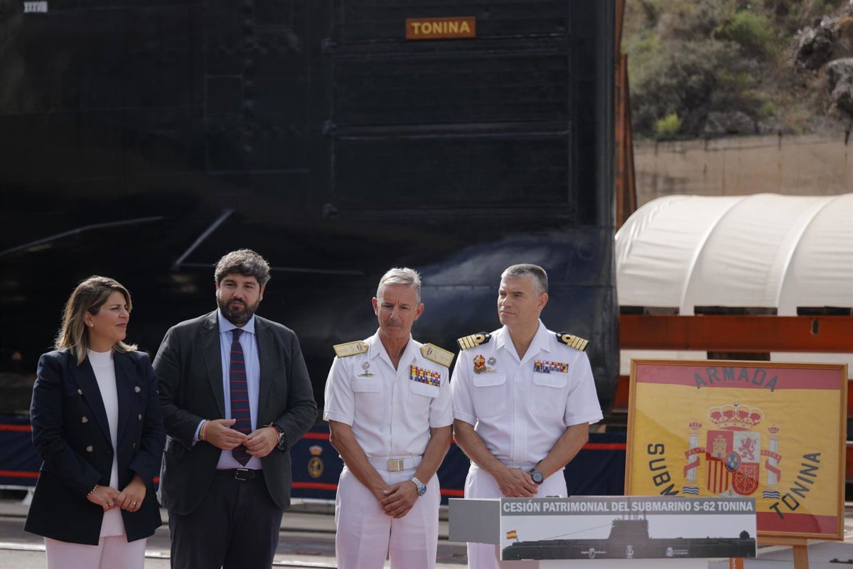 El submarino 'Tonina' S-62, con más de tres décadas de servicio en la Armada, ha pasado este viernes oficialmente a ser propiedad del Ayuntamiento de Cartagena tras la firma del acta de cesión entre el almirante jefe del Arsenal, Pedro Luis de la Puente, y la alcaldesa Noelia Arroyo, en presencia del presidente de la Comunidad, Fernando López Miras.
