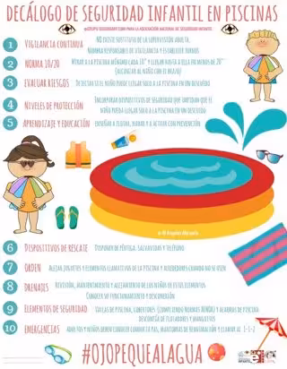En el caso de las piscinas, se pide extremar las precauciones y mantener una vigilancia continua por parte de los adultos, estableciendo si es necesario turnos. La supervisión mínima será cada 10 segundos a la piscina y en caso de tener actuar, el adulto deberá de llegar a la piscina en menos de 20 segundos a ella y alcanzar al niño con el brazo.