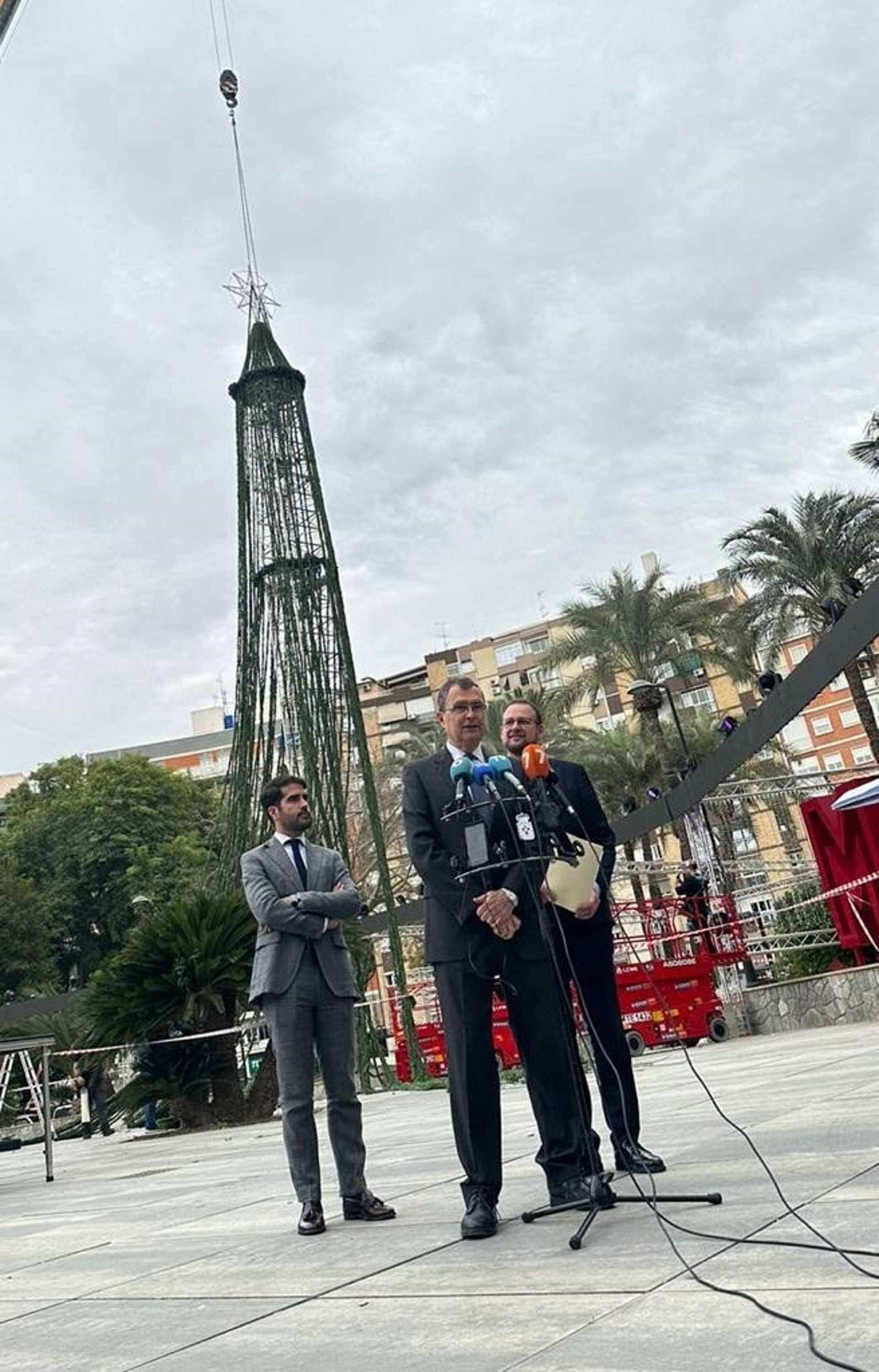 El alcalde de Murcia, José Ballesta, acompañado por el teniente de alcalde y concejal de Desarrollo Urbano y Ciudad Inteligente, José Guillén, y el edil de Cultura e Identidad, Diego Avilés, han supervisado este viernes los trabajos de montaje del gran árbol, que será inaugurado el sábado 9 de diciembre, a las 19.00 horas, con un gran espectáculo de luz, fuegos artificiales, actuaciones musicales y otras sorpresas.