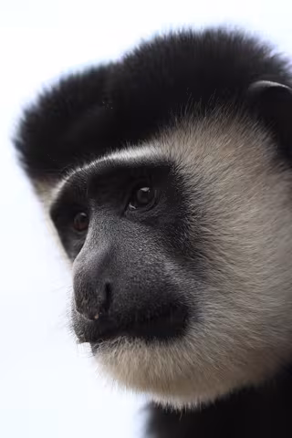 Los colobos son especies arbóreas, que suelen vivir en zonas del centro de África. Su pelo blanco alrededor del rostro destaca sobre la coloración negra que predomina en el resto de su cuerpo. Una de sus principales características, es su larga y voluminosa cola blanca y los faldones de pelo blanco que cuelgan de su cuerpo.
