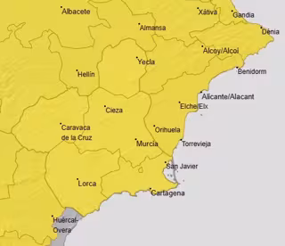 Toda la Región de Murcia permanecerá este viernes, desde la medianoche hasta las 8.00 horas, en aviso amarillo por tormentas y lluvias, según la última actualización de la Agencia Estatal de Meteorología (Aemet).