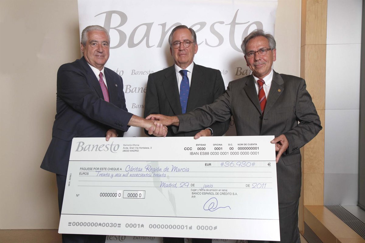 El presidente de Banesto, Antonio Basagoiti, hizo entrega ayer del importe íntegro de la donación a Rafael del Río Sendino, Presidente de Cáritas Española, y a Antonio Sánchez Martínez, Secretario General de Cáritas de Murcia y miembro del Consejo General de Cáritas Española, en un acto celebrado en la sede de Banesto, en Madrid.