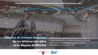 El número de jóvenes con empleo ha alcanzado su máximo de los últimos seis años en la Región de Murcia, tal y como ponen de manifiesto los últimos datos del Instituto Nacional de Estadística. Así, los menores de 30 años con un empleo son actualmente 88.200, una cifra que no era tan elevada desde los 91.100 que se registraban a la conclusión del tercer trimestre del año 2012.